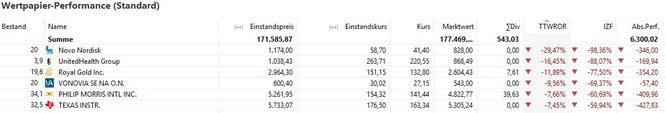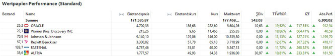 Den dritten Monat in Folge gab es eine positive Entwicklung. Es gab Kurserfolge von 5886,20 Euro, zusammen mit den Nettodividenden ergibt sich ein numerisches Plus von 6302,62 Euro bzw. 3,7%.